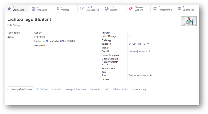 OpenEdu heeft de contact beheermodule van Odoo verrijkt met de 'Educatie' plug-in. Hiermee transformeert u een contact in een 'deelnemer' aan het educatieve proces.